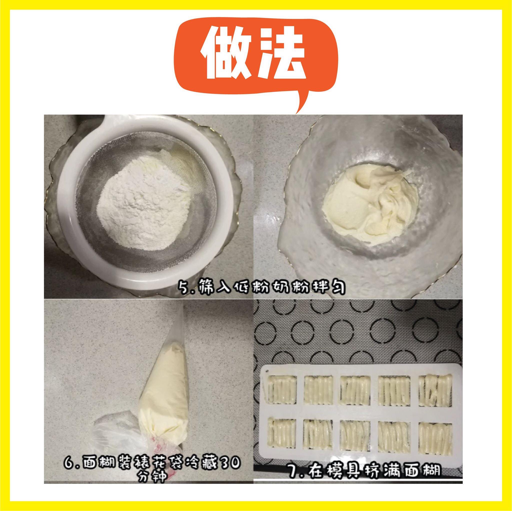 3️⃣过筛的低筋面粉+奶粉加入牛油中拌匀,面糊装进裱花袋冷藏30分钟!