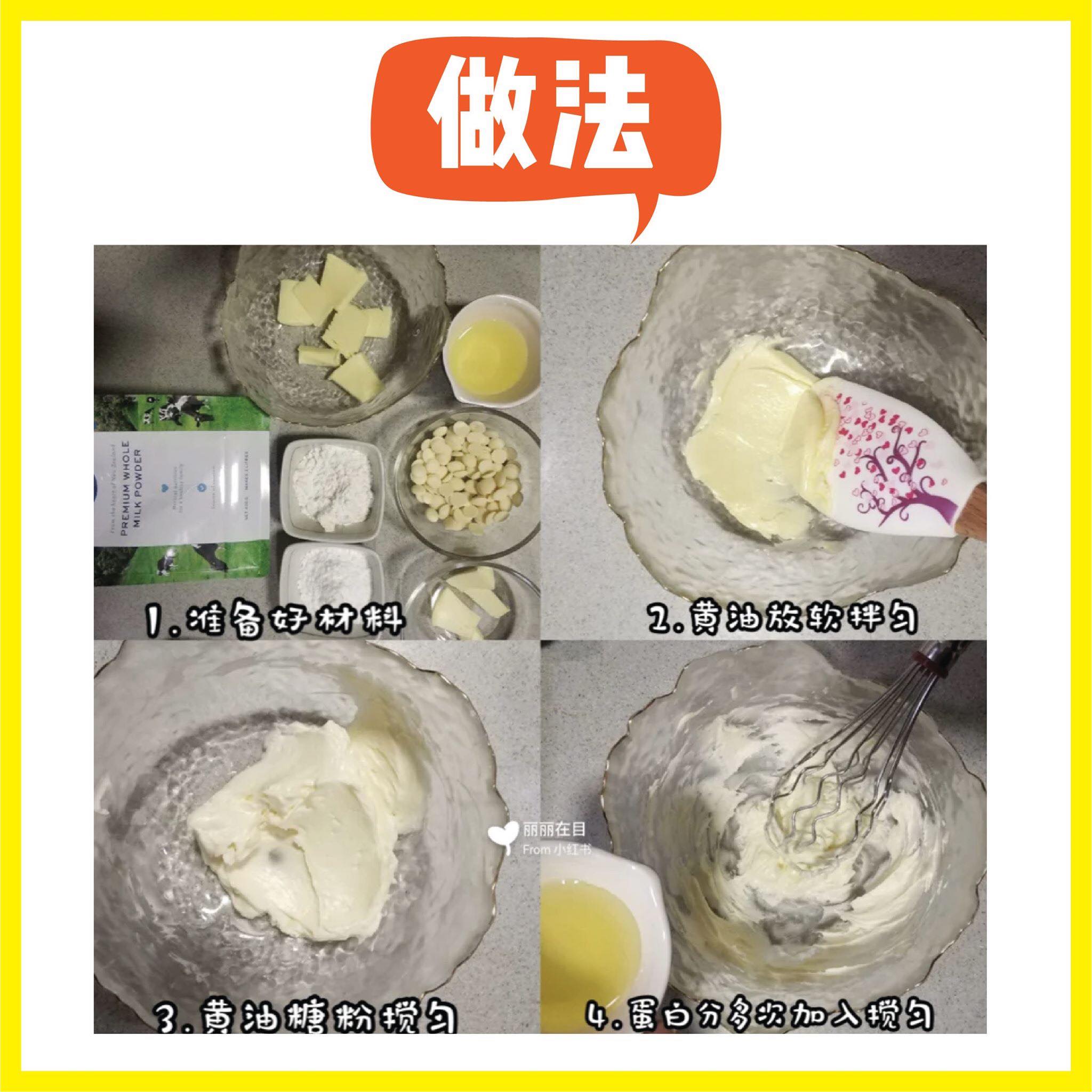 6️⃣白巧克力隔热水融化,加牛油融化拌匀+奶粉拌匀然后装进裱花袋里!
