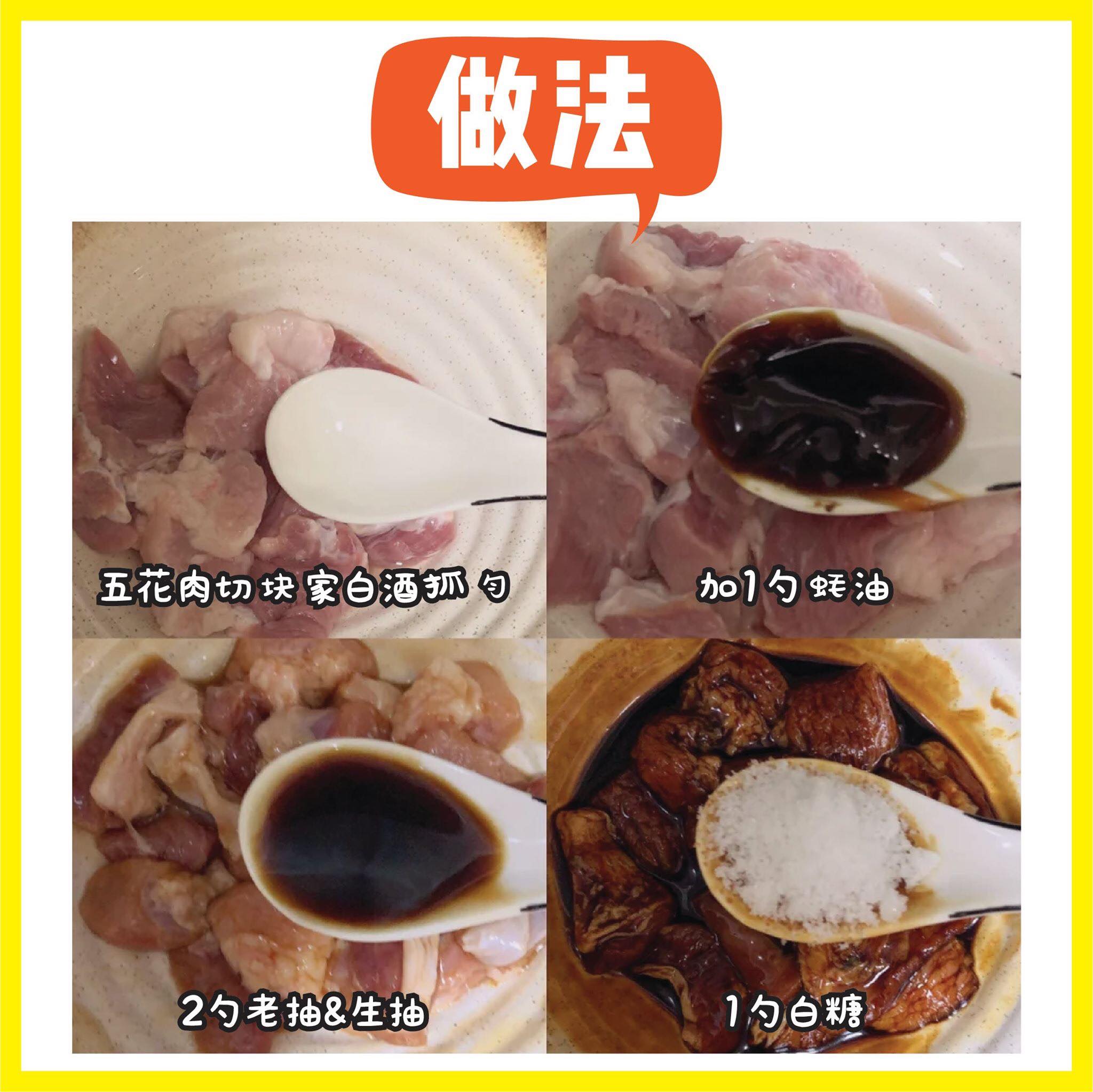 2️⃣五花肉切块,加1大勺白酒用手抓匀,抓到酒气消散去腥,加2勺生抽和老抽,1勺白糖,1勺蚝油搅拌均匀,盖上保鲜膜放入冰箱腌制一晚!