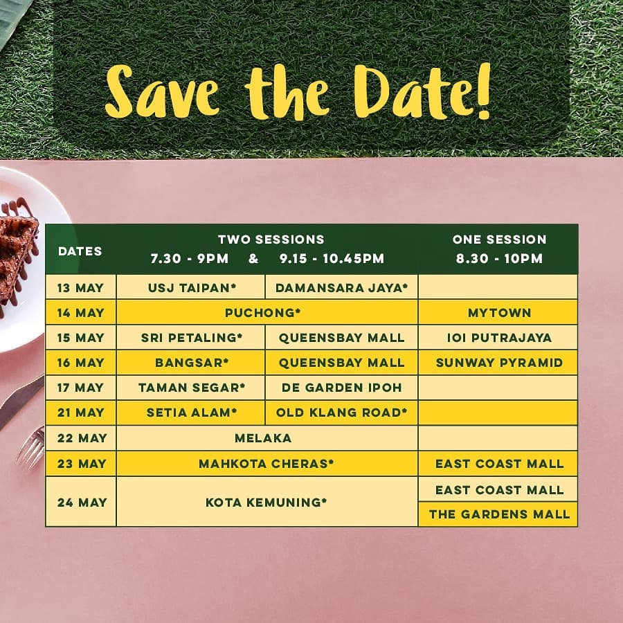 (De Garden Ipoh, East Coast Mall, IOI Putrajaya, Melaka, MyTown, Queensbay Mall, Sunway Pyramid, and The Gardens Mall)
