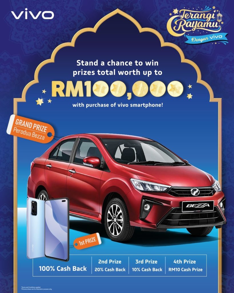 好康来啦!配合开斋节的到来,vivo非常豪爽地准备了超多大奖要送给大家哦!当中就包括了高达100%的现金回扣以及价值RM10的现金奖等哦!另外还有大家梦寐以求的超级豪礼,一辆Perodua Bezza也等着幸运儿来赢取哦!哇~ 这么诱人的大奖,谁抗拒得了啊!