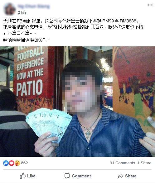 RM99至RM3888,抱着尝试的心态申请,竟然让我轻轻松松赢到几百块,服务和速度也不错,不拿白不拿。。哈哈哈哈谢谢啦BK8 ^_^”